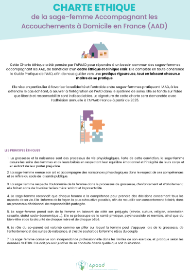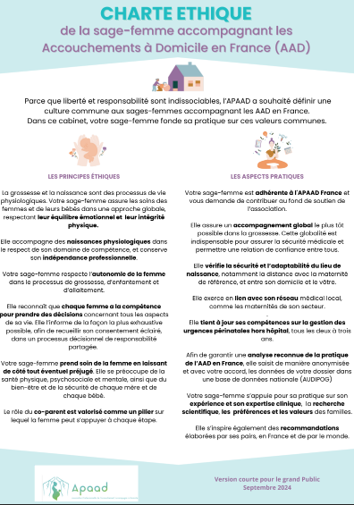 La charte a été pensée pour répondre à notre souci commun de créer un contrat d’engagement qui nous lie, en autonomie et en responsabilité les un.e.s vis-à-vis des autres, autour d’un cadre éthique et pratique clair. Elle complète en toute cohérence le Guide Pratique de l’AAD, afin de guider les sages-femmes vers une pratique rigoureuse, tout en laissant chacun.e maitre de sa pratique. Nous restons une profession médicale autonome et la démarche n’est pas de contraindre, mais bien de guider et donner un cap et une orientation collectifs.